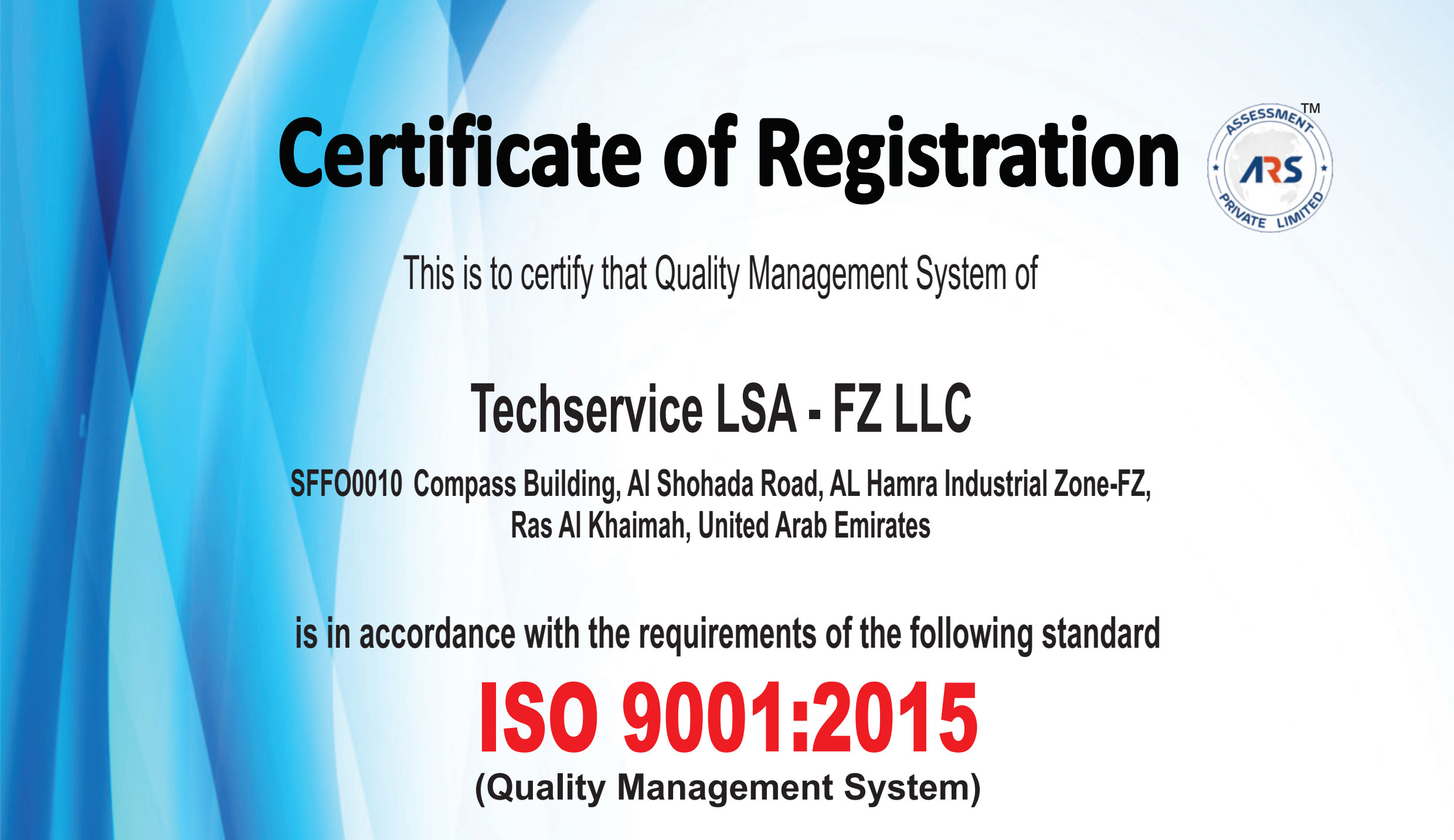 Quality management system is compliant with the ISO 9001:2015 standard.